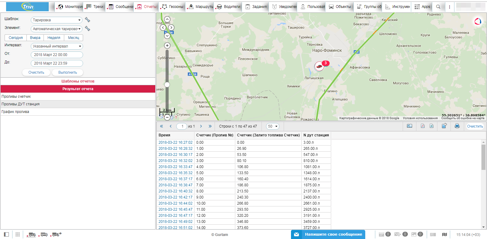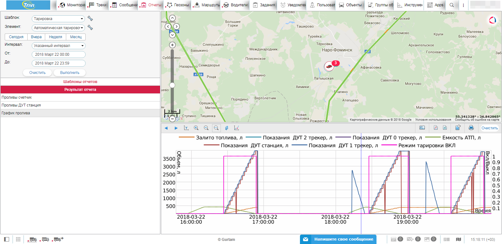 Данные о количестве пролитого топлива, номерах проливоов, режимах работы передаются в трекер для передачи на сервер мониторинга. В результате на сервере имеем статистику работы станции, данные о проливах и т.п. Данные используем для построения тарировочных таблиц.
