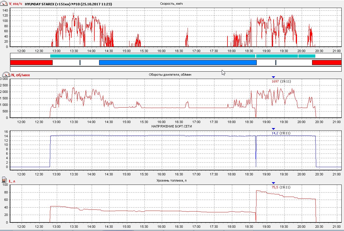 Да вроде не зависят показания ДУТа от скачков напряжения в борт сети. Судя по графикам, видно , что на холостых и при начале движения, где поднимаются обороты, топливо не гуляет.