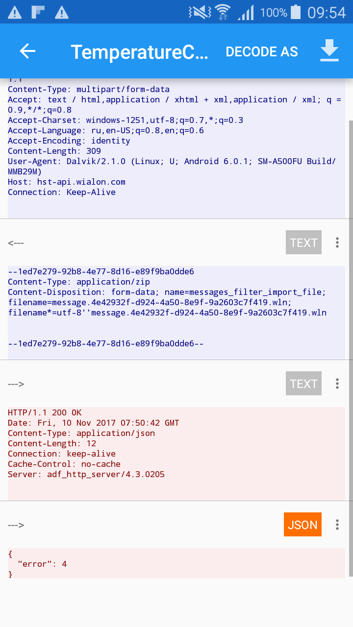 Now, I've double and triple checked the Post request I send as well as the upload file. As a proof there are two upload zip files attached, one with the simplest message entry possible, and one with two message entries with a bit more data substance. I've also tried to upload them via the Wialon hosting UI, quite successfully. The post request headers and content are set exactly as specified in the documentation, nevertheless here is the c# code that does that.