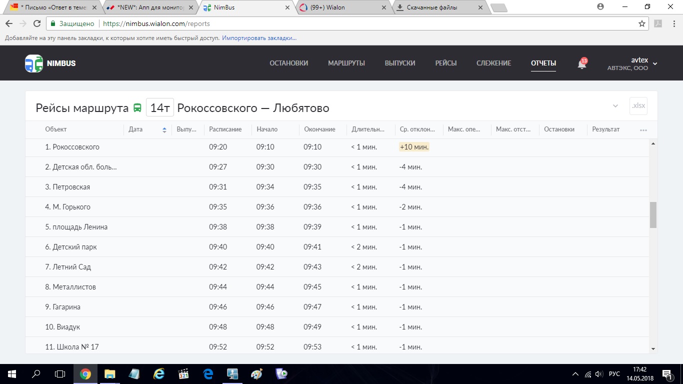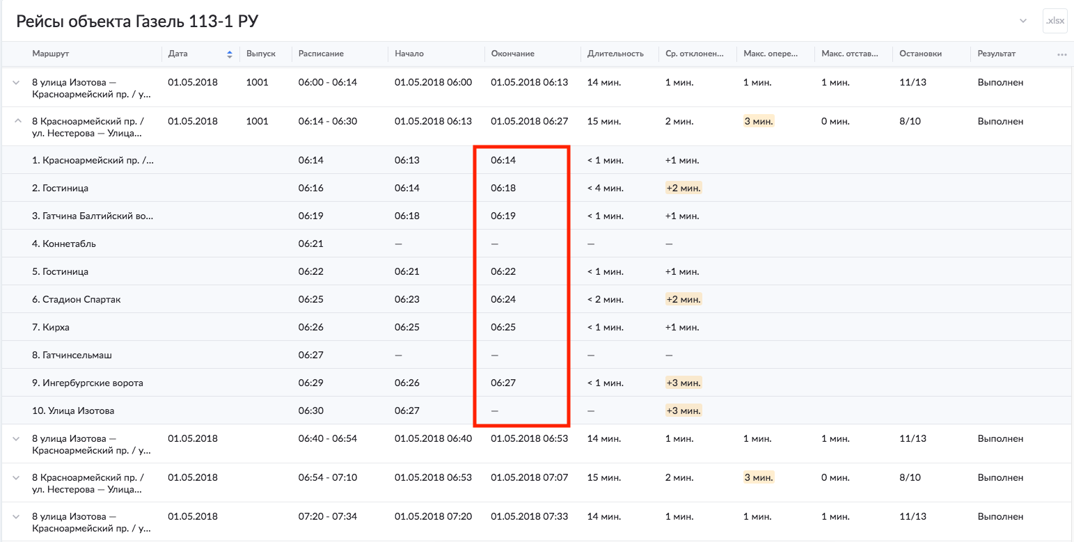 avtex.pskov, ну да, так и получается в тех случаях, когда начальная и конечная - это одно и то же, и между соседними рейсами проходит совсем немного времени. Но по времени отправления их точки, которое указано в отчете, в целом можно судить, было ли нарушение или нет.