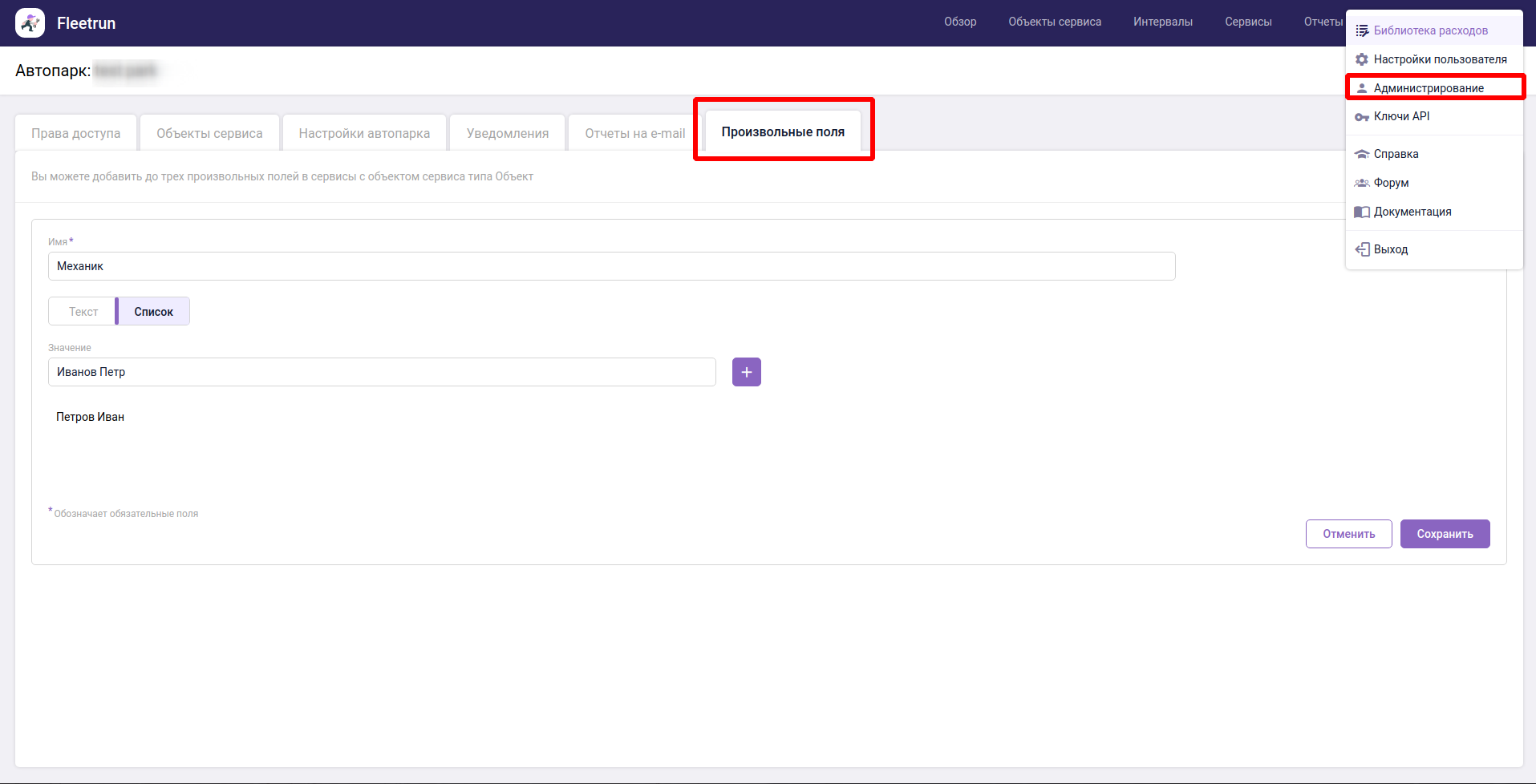 1. Сервис: Добавление произвольных полей в сервис администратором