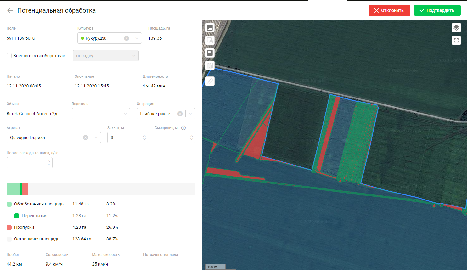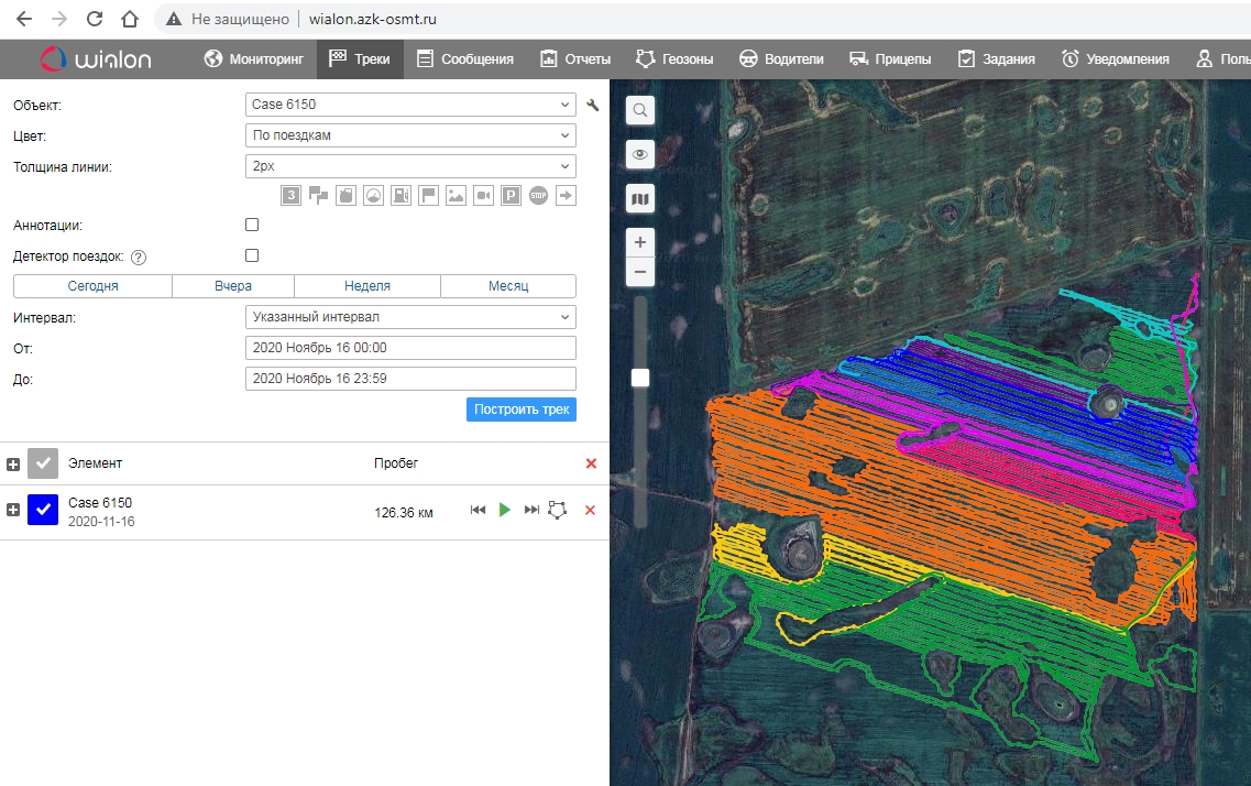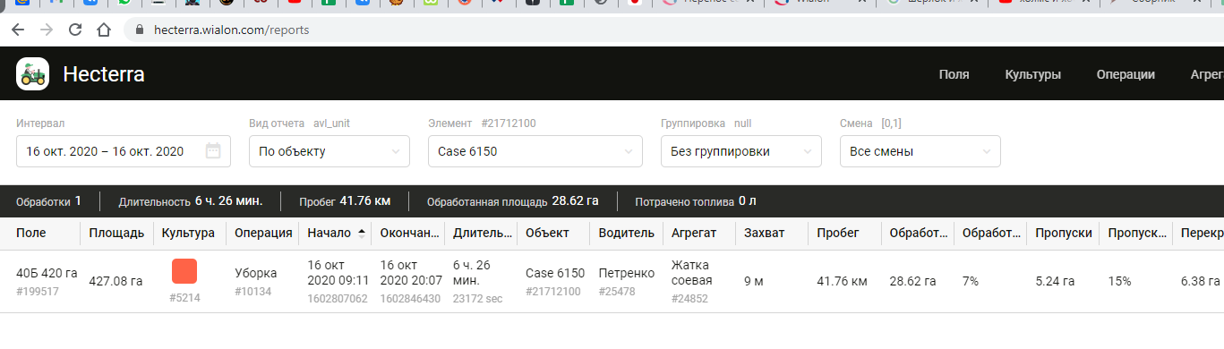 По данным Wialon комбайн Case 6150 находил за период с 16.11 07.00 до 17.11 07.00 130 км. Учитывая ширину жатки 7м убранная площадь составляет примерно 90га, по данным Hecterra результат совершенно другой.