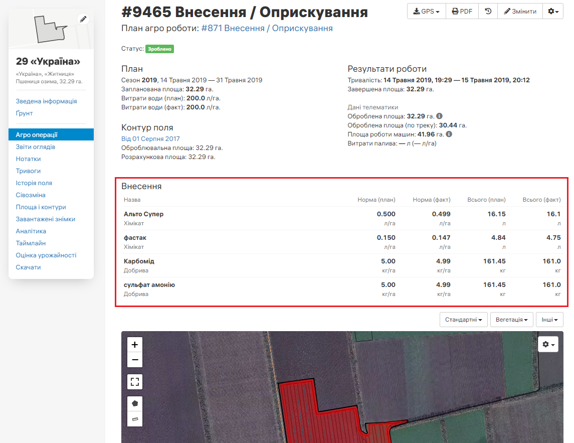 • обработка СЗР (л, кг, ц/га)