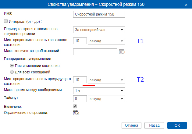 Поясню на примере. Мы настроили уведомление на превышение скорости 100 км/ч. Минимальное время  тревожного сигнала выставили 20 сек. Что бы много уведомлений не сыпалось, включили "Генерировать уведомление при изменении состояния" и выставили мин. продолжительность предыдущего состояния 1 минута.
