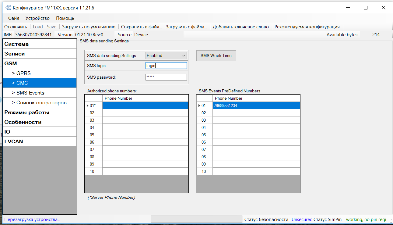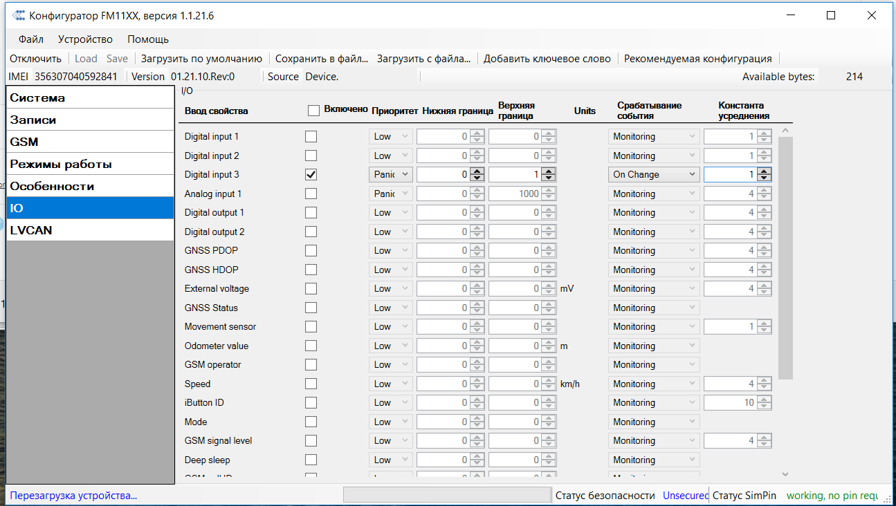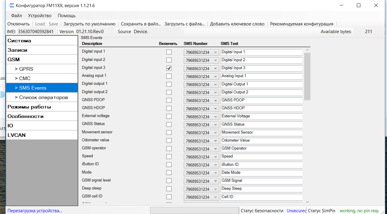 Ребята, подскажите как правильно запрограммировать FM1100 отправку смс по 12 вольтам на DIN 3. Всю ночь просидел методом перебора комбинаций, а он смс при подаче напруги на DIN3 не отправляет. При отправке комманд вида login password setpin 11 ответ отправляет, симка значит работает. Куда копать? Спасибо заранее! Присоединил скриншоты конфигуратора.