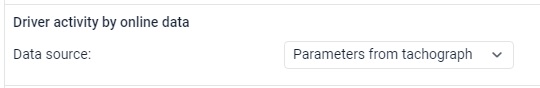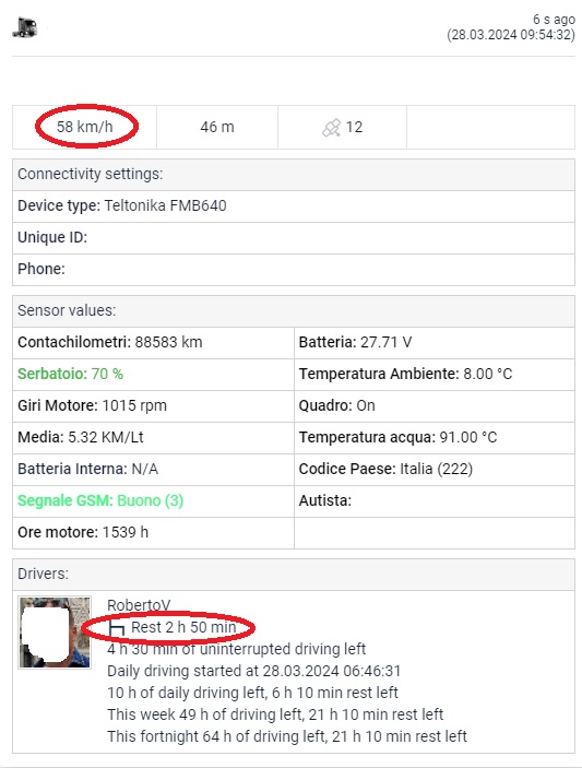 The vehicle detail window displays the driver paused even when the vehicle is travelling. The messages rightly indicate type 3 activity (driving) and in the advanced settings there is the setting for reading the tachograph data.