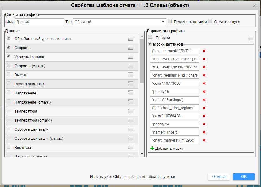 - маркеры на графиках (заправки, сливы, превышения, события, стоянки, картинки и др.)
