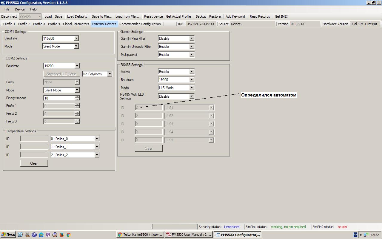 Уже отчаялся получить ответ от ТП сами-знаете-какой-компании, поэтому приходится писать на форуме. Подскажите, в чем может быть проблема? Есть 5500 на прошивке  01.03.04, подключаю 2 ДУТ Omnicomm 20160 в port 1. Проверял, скручено все нормально, провода прозваниваются, ДУТ - рабочие. При подключении к какому-нибудь галилео данные видны. Но тельтоника ни в какую их видеть не хочет. Единственное, чего я добился пока от них это фраза: "Настройки трекера не корректны. Ознакомьтесь с инструкцией на прибор. на стр 125-126 описано подключение LLS ДУТ через интерфейс RS-485." Но в этой инструкции настройки заданы точно такие же!