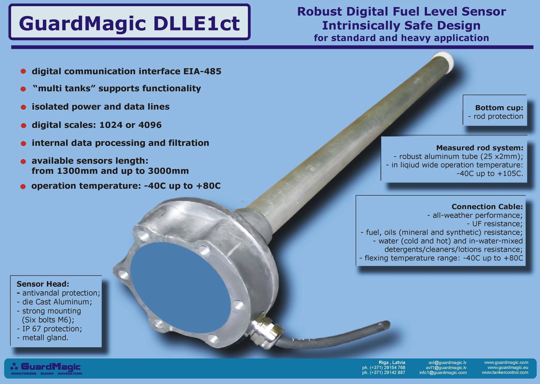 Fuel and Oil level sensor GuardMagic DLLE1ct is intended for fuel level measurement in mobile and stationary tanks, road fuel tanker cargo tanks, fuel storage tanks, fueling station etc.