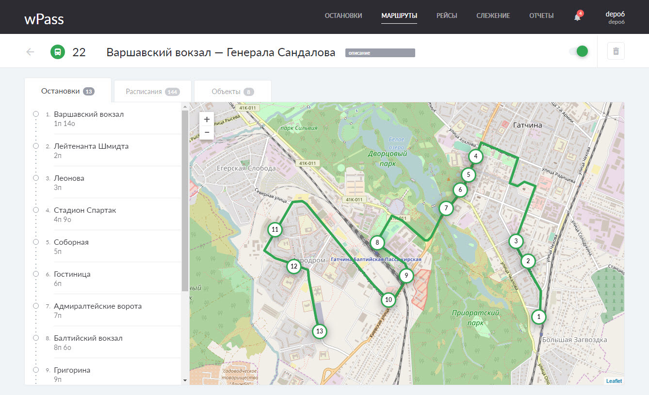 Далее, из остановок "собираются" маршруты. Система сама прокладывает путь по дорогам от одной остановки до другой, однако вы можете при необходимости отредактировать этот путь по своему усмотрению.