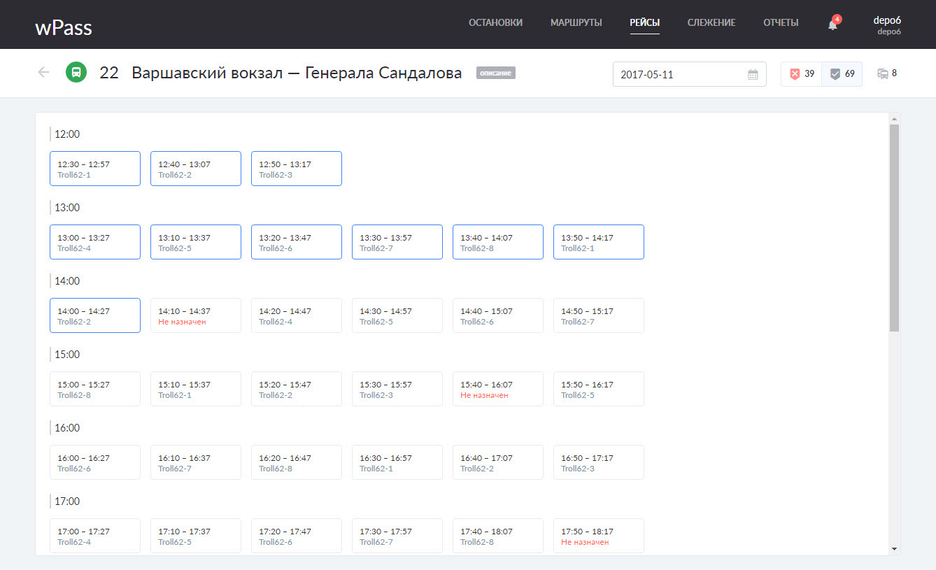 Предварительно можно оценить планируемые рейсы, а также проверить правильность назначения объектов на них, на специальной вкладке. Назначение Т/С на рейсы может происходить как автоматически (указывается в настройках расписания), так и диспетчером вручную.