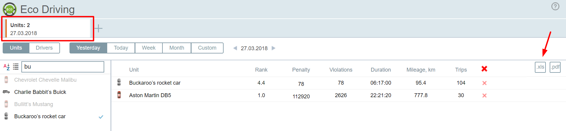 Firstly, we have added an ability to export data directly from Eco Driving (now there is no need to use Wialon for exporting the same data). The data regarding all selected units and a particular unit can be exported.