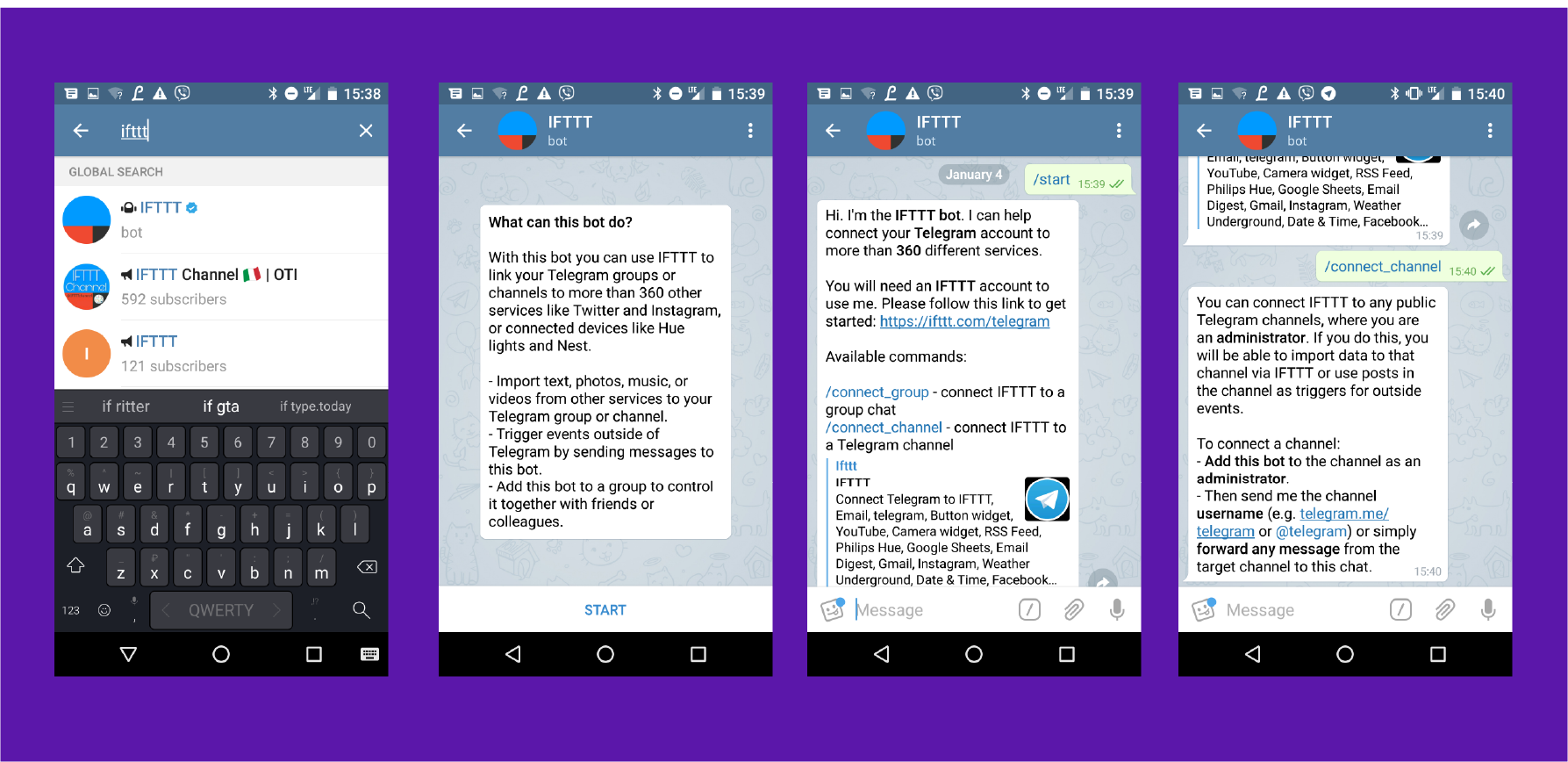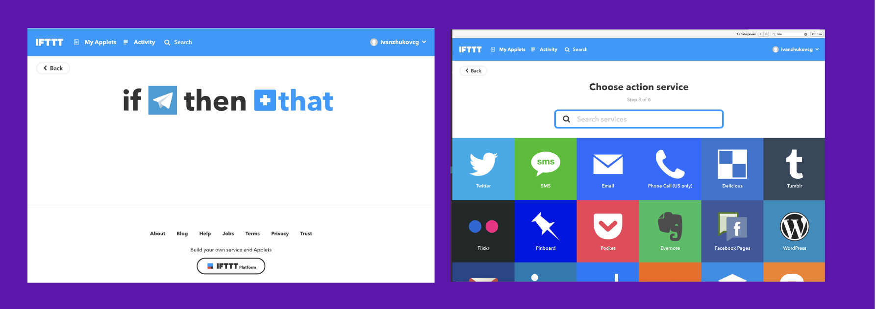 Далее: находим в телеграме бот IFTTT (по поиску среди пользователей. Пишем ему /start