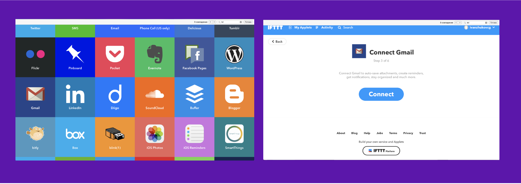 а gmail и далее следуем инструкциям, которые вам предложит сам сервис IFTTT.