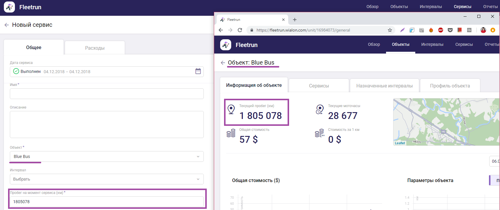 На скриншоте сервис регистрируется для объекта Blue Bus, по умолчанию для него выставлен текущий пробег, который равен текущему пробегу на страннице данного объекта.