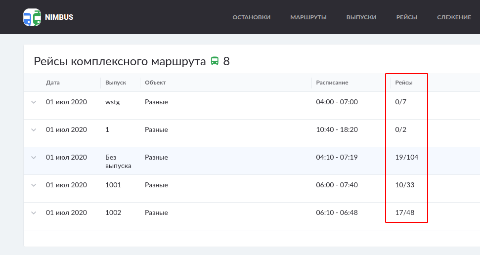 На данный момент эту информацию можно найти в колонке "Рейсы" (см. скриншот). Насколько я понимаю, вам такой способ не подходит, вы хотите видеть общее количество рейсов по всем маршрутам, входящим в состав комплексного?