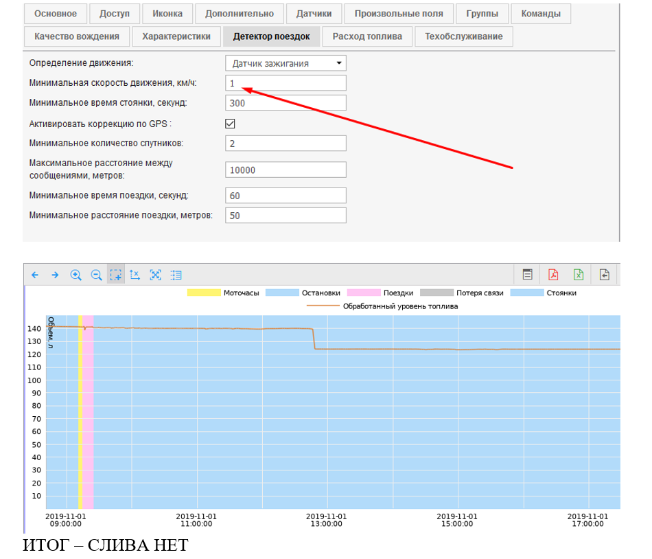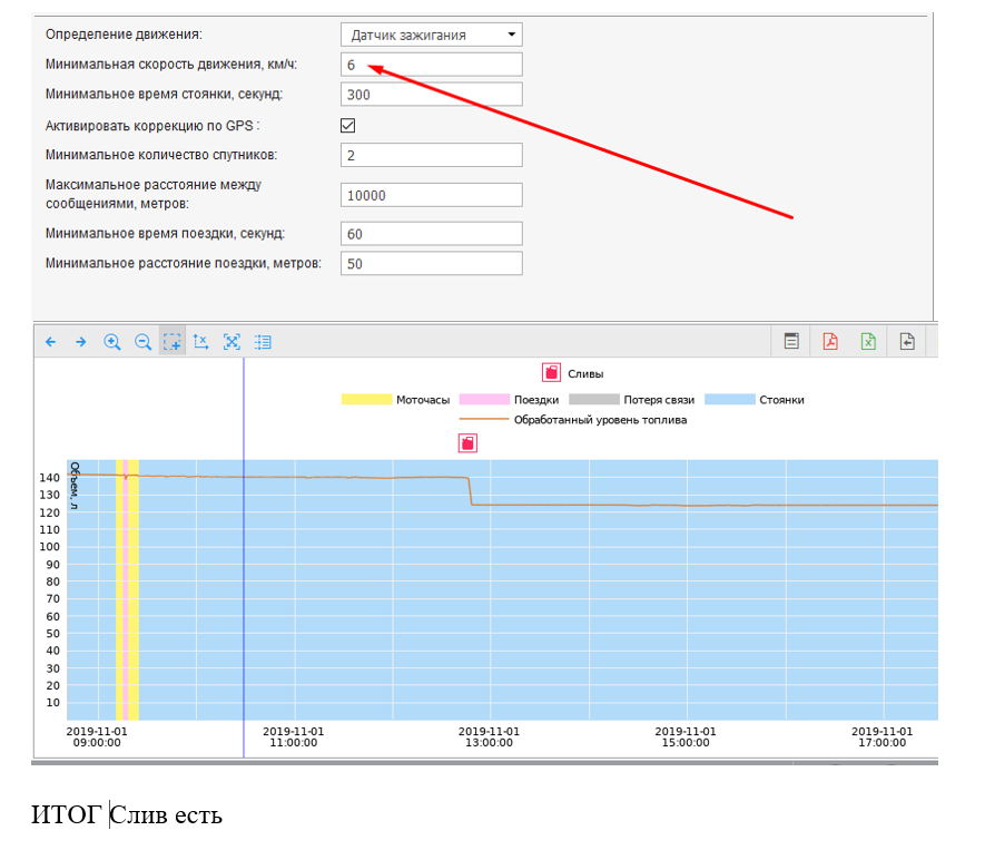 Для начала я Вам отправлю ответ техподдержки Вашей компании и из него Вы поймете ,что слив не засчитан именно из-за того что сообщение с координатами идет со скоростью которая превышает скорость в детекторе поездок. если в детекторе ее сделать больше чем в сообщении, соответственно ПО посчитает что ТС стоит и слив будет засчитан. иначе считается что ТС движется и не важно что в момент слива у тс НЕТ координат.