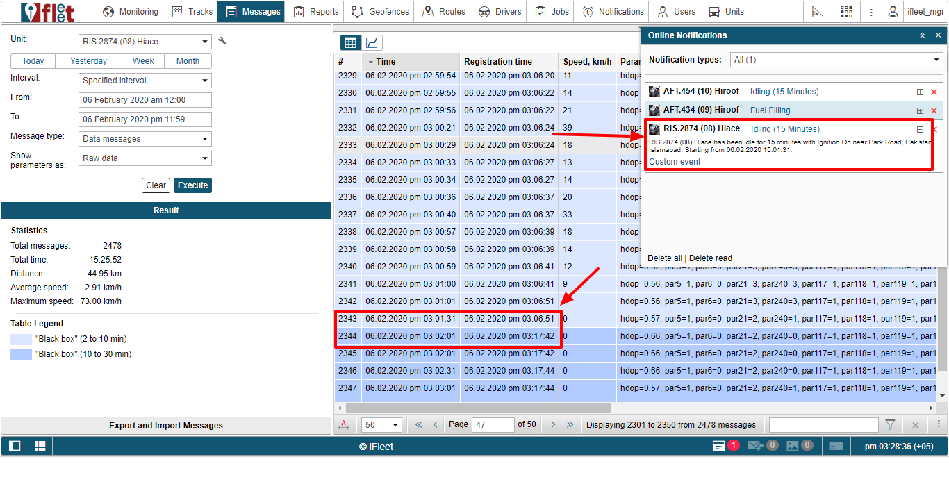 After that, unit comes online and upload all the black box messages to the server. Then we come to know that the unit was actually moving at the same time when the notification about 'Idle for 15 minutes" was triggered.