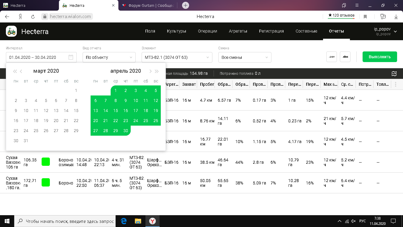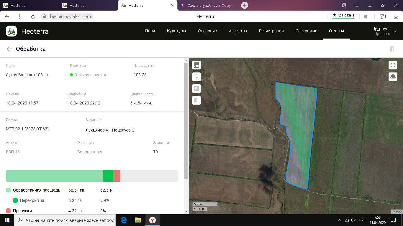 2. Используйте назначения водителей, чтобы разделить обработку поля одним объектом на две обработки в соответствии с работой разных водителей. Водителей нужно назначить в Wialon до того, как искать обработки. Если у вас уже есть такие “слипшиеся” обработки, то удалите их, назначьте водителей и перерегистрируйте заново. В Hecterra действует правило: в момент смены водителя или прицепа начинаем новую обработку.
