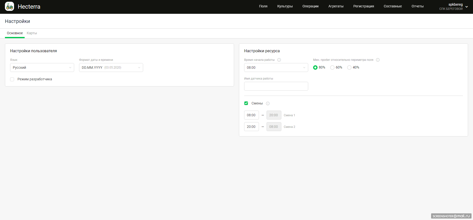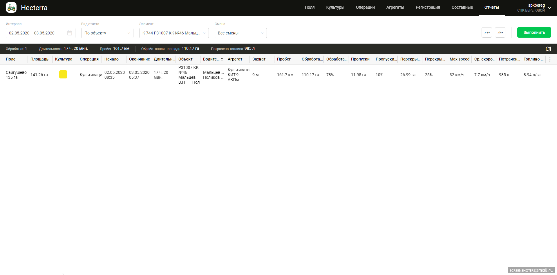 o.rosenko wrote:Добрый день. На поле выполняются работы и меняются только водители физически , объект не выезжает с поля, привязки по карточкам нет, при регистрации обработки получается один интервал в сутки (https://prnt.sc/vkm1fm) и нужно разделять работу по сменам. Когда настраиваешь смены в настройках ресурса, то как пишет справка вся работа уходит в одну смену если большая часть обработки попадает в допустим первую смену, хотя по факту работа была выполнена в 2 смены , просто в одной больше гектар ,а в другой меньше . Было бы отлично что бы выводилось как в Wialon , обрезало интервал и выводило чётко по установленым сменам количество работ.