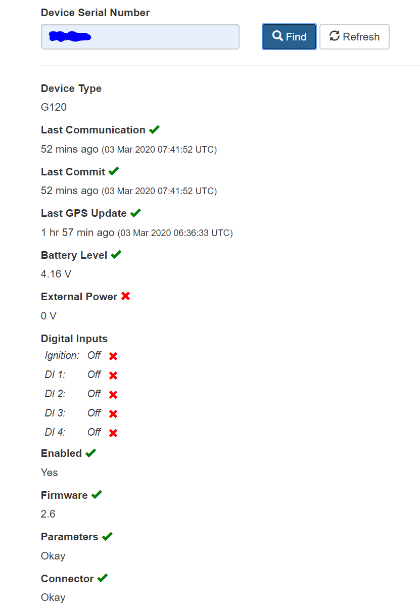 We have recently changed hardware providers, and we are wondering what processes other Gurtam partners are using to check their device's during and after installation. Our previous hardware provider offered an installer page that allowed installers to search a device's status by its serial number, as in the image attached.