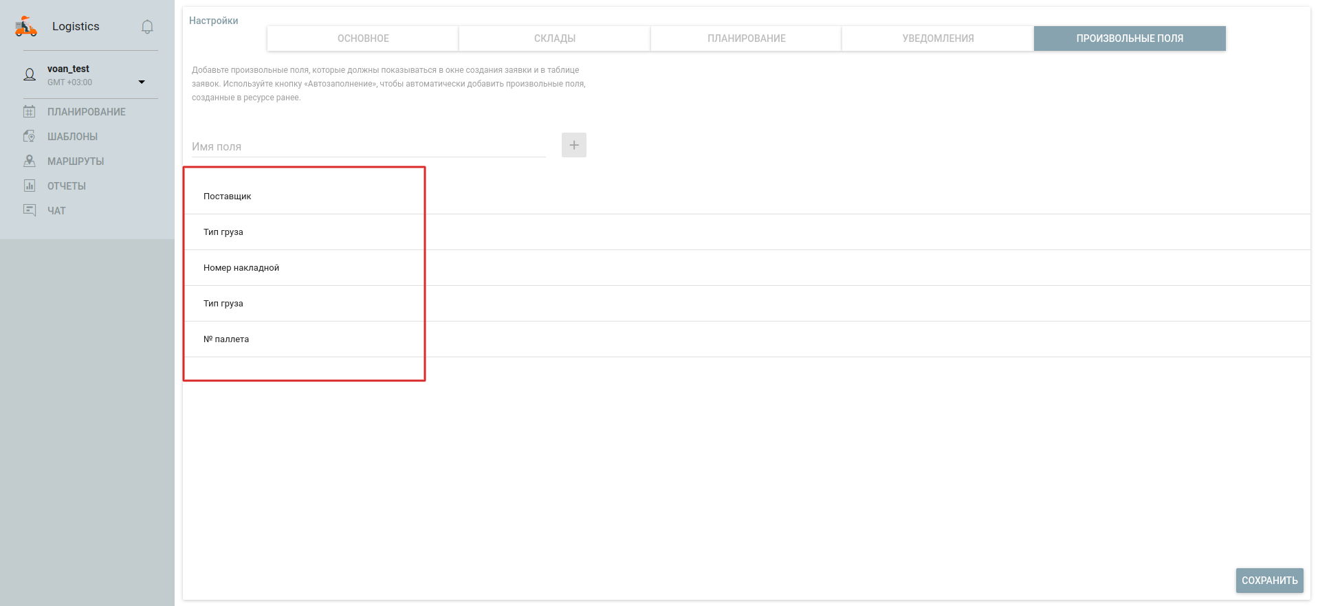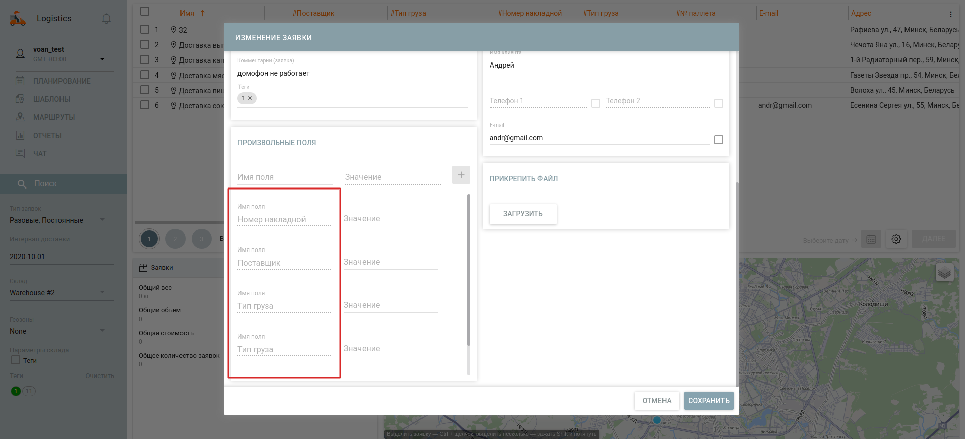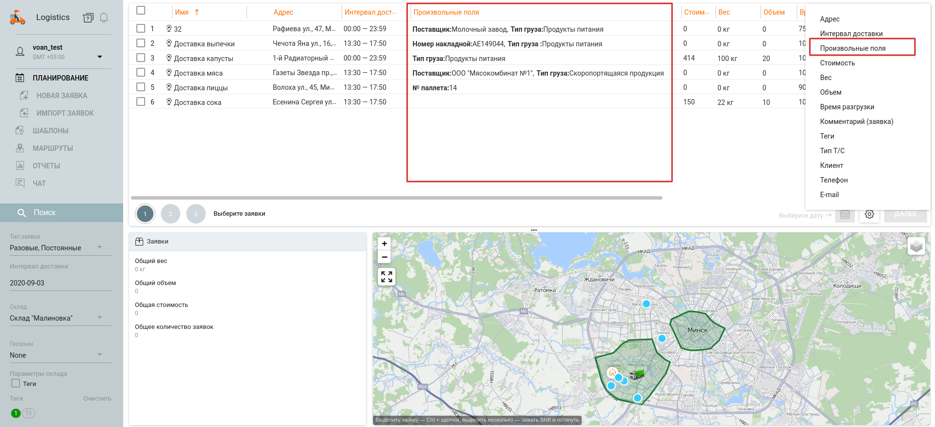 Предусмотрена возможность добавления, удаления, а также редактирования значений произвольных полей на этапе планирования, в активных и планируемых маршрутах.