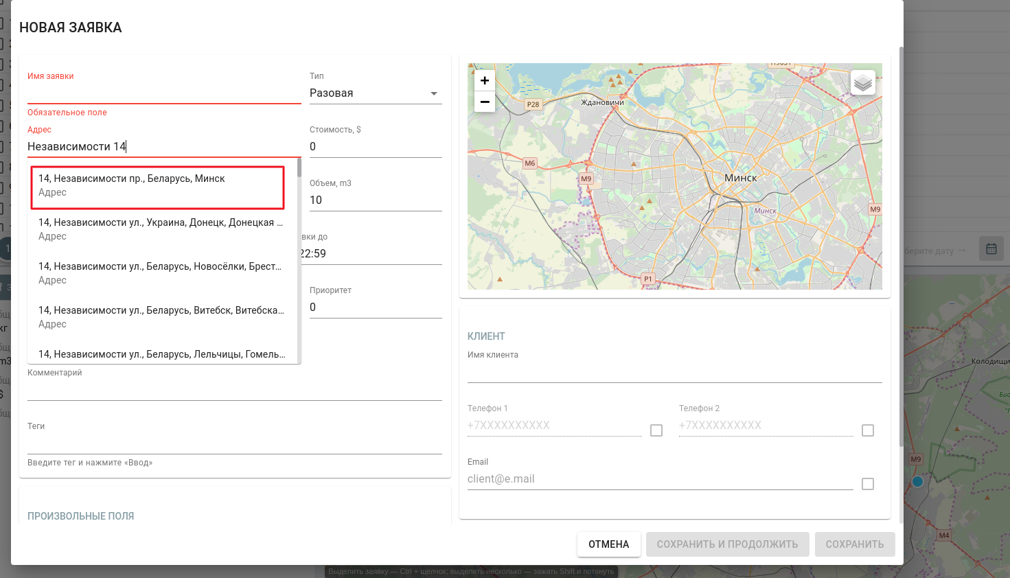 Теперь при создании заявки в поле “Адрес” можно вводить координаты. Данная функциональность будет полезна, если доставка осуществляется на заправки или в места, где нет адреса (обочина вдоль дороги, остановка).