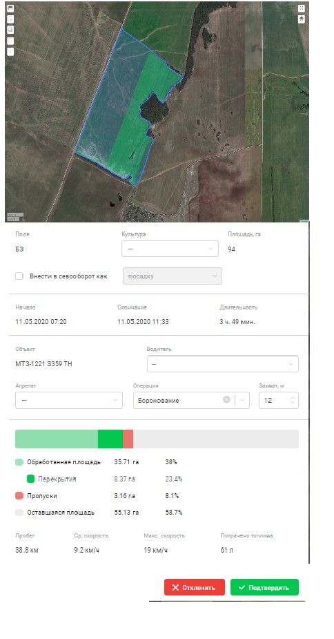 И в идеале, по возможности, просмотр обработок внутри поля в текущем сезоне. Это требуется порой для понимания источника лшибки. Часто, по результатм полевого осмотра визуально видны ошибки на поле (непросевы, клинья, косяки), зоны сниженной вегетации и т.д. И, одна из первых вещей, которая анализируется - что делали (опреции) и кто делал (механизатор) на этом поле.