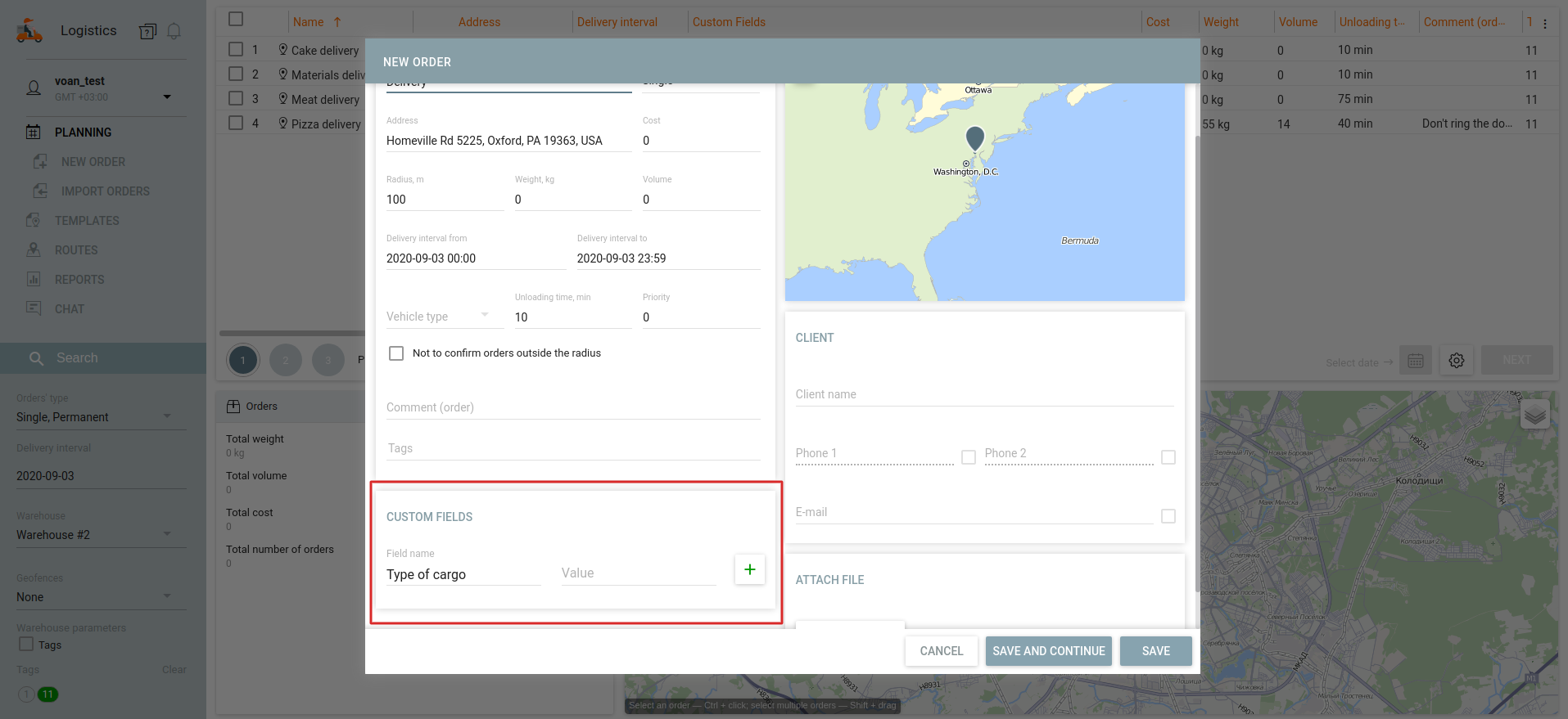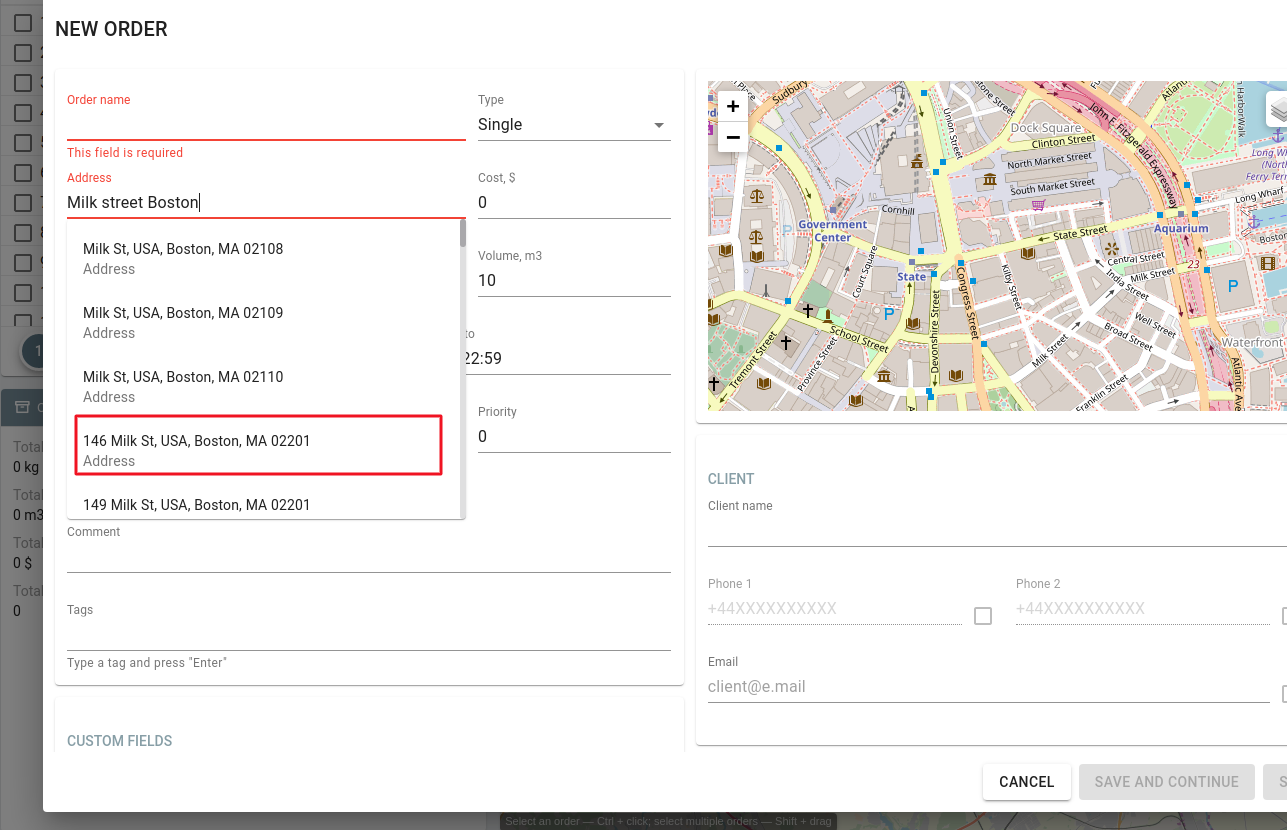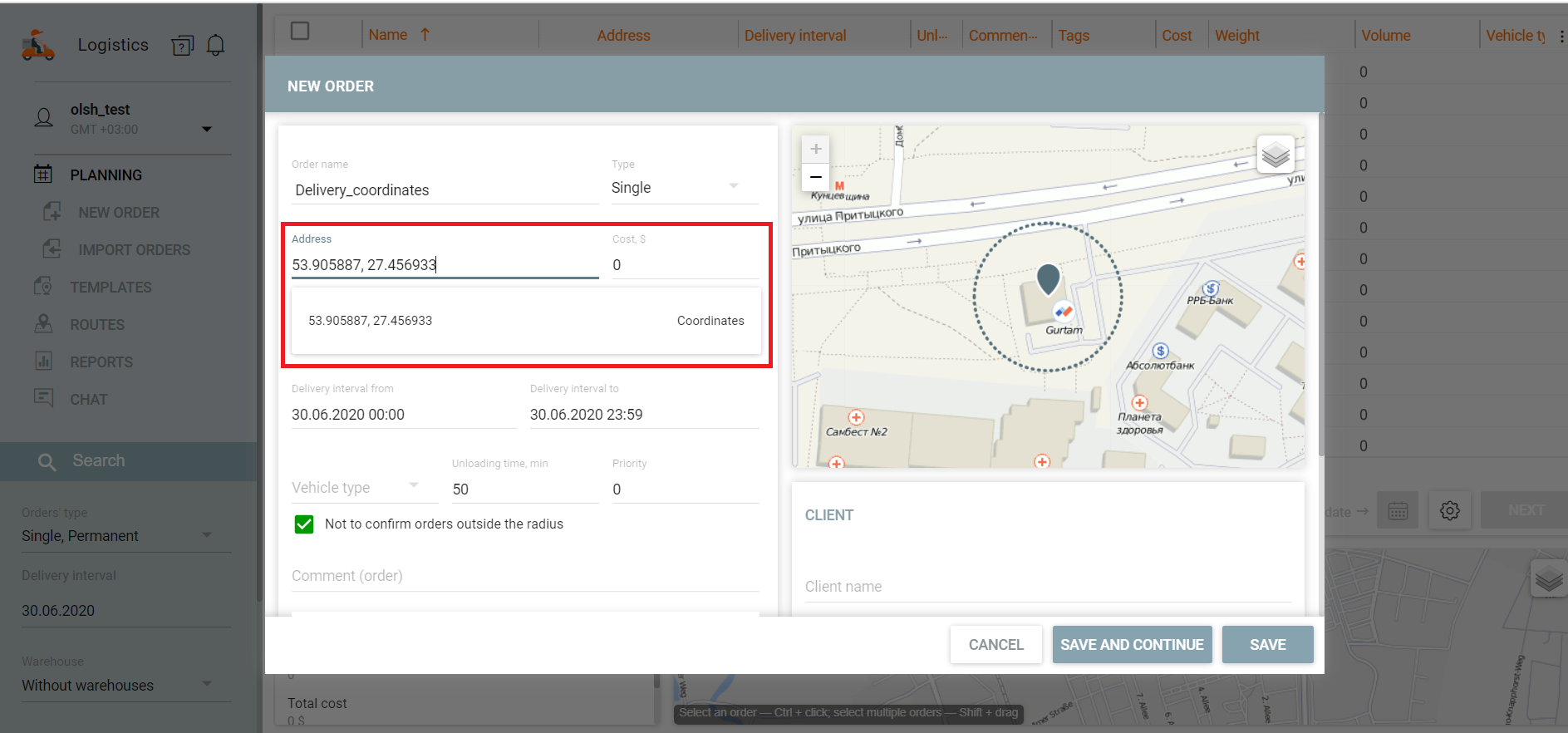 Now, when creating an order, you can enter the coordinates in the “Address” field. This functionality will be useful if delivery is carried out at gas stations or at places where there is no address (roadside, bus stop).