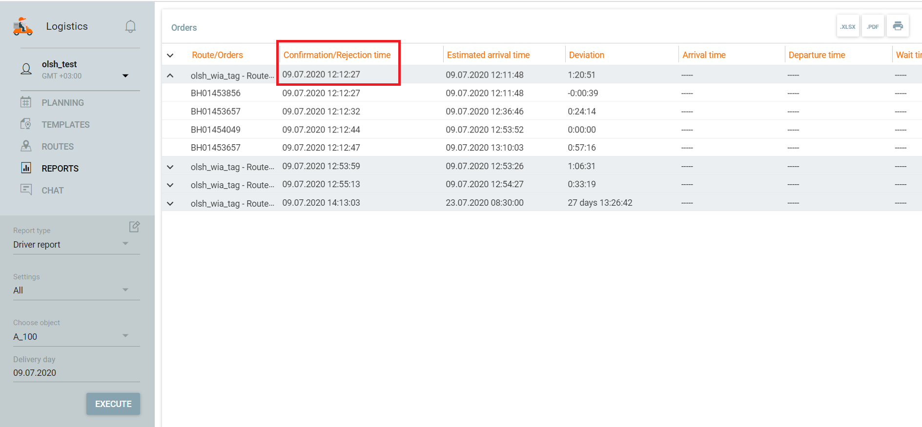 A new column "Confirmation/Rejection time" has been added to the reports. This column records the registered confirmation time and the rejection time of the order.