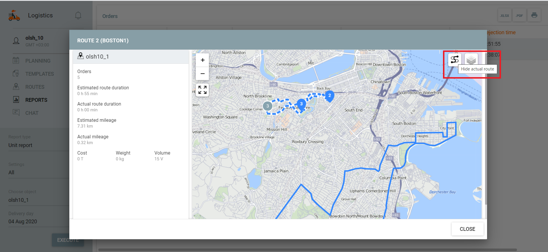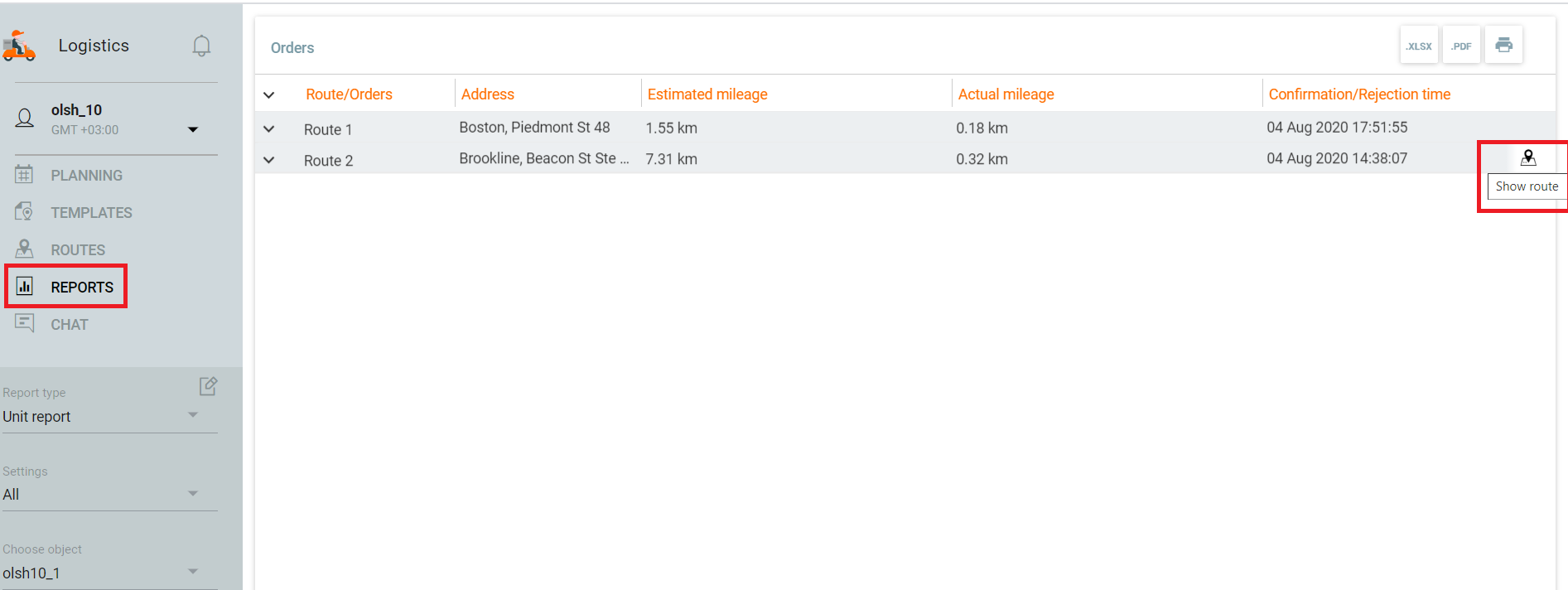 A new option "Show route" has been added to reports. By clicking on this option, a modal window opens, which shows the planned route of the object.