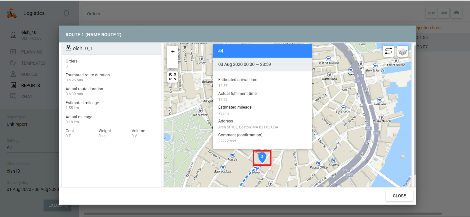 Also, when you click on the order icon in the route, you can see information about the selected order. The route information window provides information about the selected route.
