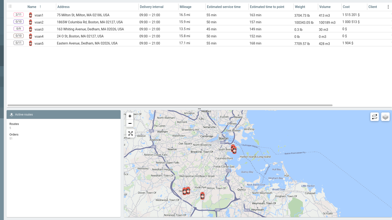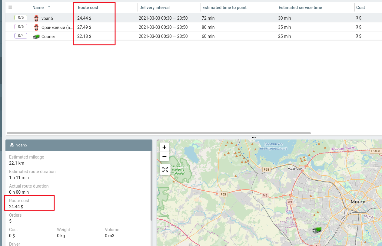 By specifying the cost for at least 1 parameter, the optimization algorithm will calculate the cost of each route, which will be displayed at the 3rd planning step and on the "Routes" tab both in a new column and in an additional block.