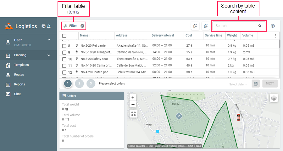 The filter and the search have been moved from the navigation bar to the toolbar above the tables on the Planning, Templates, Routes, Reports, and Chat pages. The search is now also available at the third stage of planning and in reports.