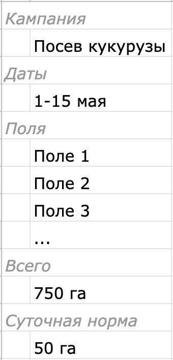 Например у клиента 12 полей  с кукурузой и необходимо наблюдать сколько всего % кукурузы обработано, а сколько осталось по полям в сумме.
