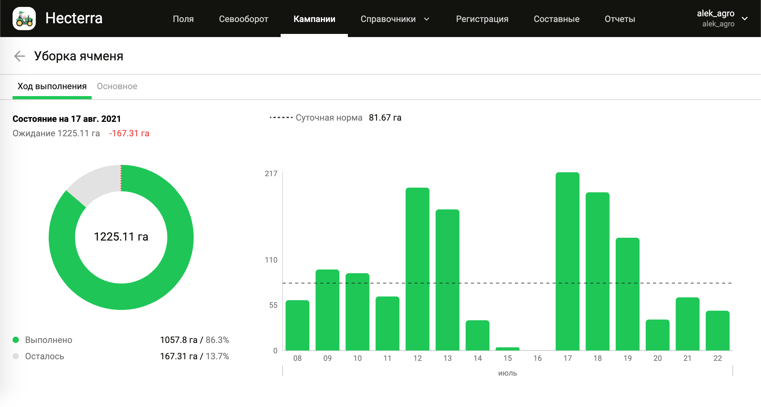 Для большей наглядности посмотрите скриншоты, которые прикреплены к этому сообщению. Картинка 3 — это графики, отражающие прогресс хода кампании. Слева — сколько всего выполнено и сколько осталось (в гектарах), а также указание на то, в какой точке мы должны быть сейчас и идет ли  кампания с отставанием или опережением. Справа — посуточный факт выполнения (сколько обработало гектаров за каждый день).