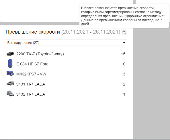 - В блоке "Превышения скорости" показаны нарушения, которые были зарегистрированы согласно методу определения превышений "Дорожные знаки" (Файл#3). Добавьте возможность выбора метода, как это реализовано в свойствах объекта во вкладке "Дополнительно"(Файл #4).