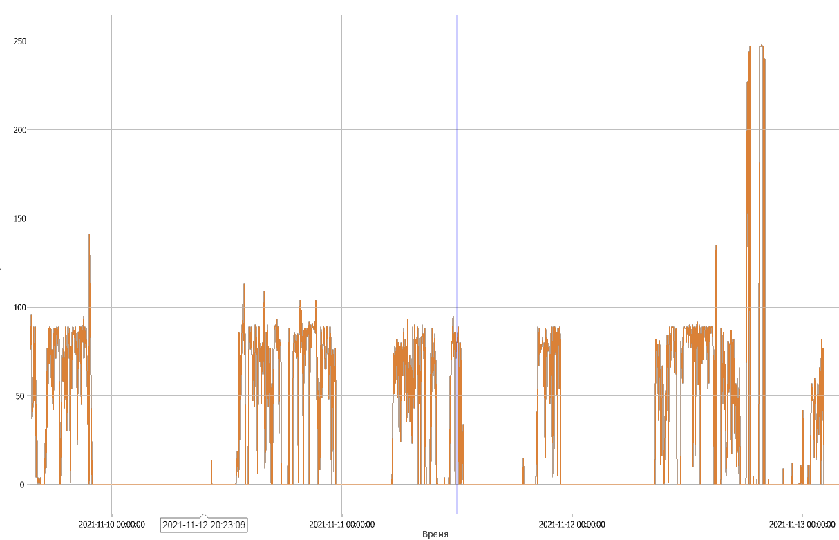 Я понимаю, когда на мы видим графики всплеска скорости в виде полочки 250 км/час на стоянках. Полагаю, что подмотка выдаёт скорость фиксированной величины. И тут вроде как вопросов нет...