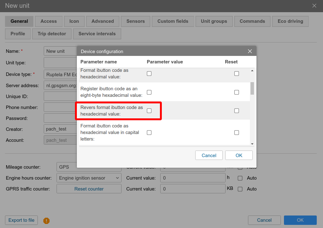 But no exist option: "I suggest checking the configuration in the General tab of the unit's properties, and making sure the option «Revers format ibutton code as hexadecimal value» is unchecked (you may also activate the option «Format ibutton code as hexadecimal value»):"