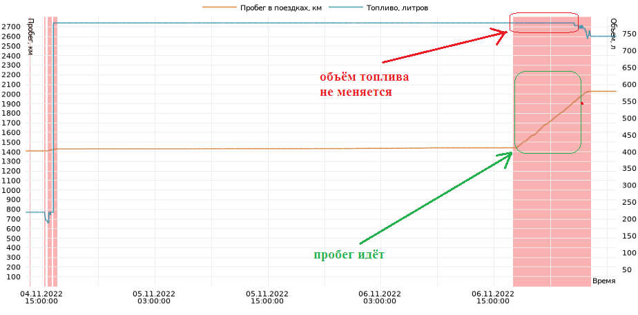 Т.е. если пробег идёт, а уровень топлива падает (как раз эта "невидимая" зона, отмечено красным) - то брать в основу данные с параметра расхода, если уровень топлива меняется - то данные с параметра уровня. Т.е. из нашего примера объём заправки он должен считать так: