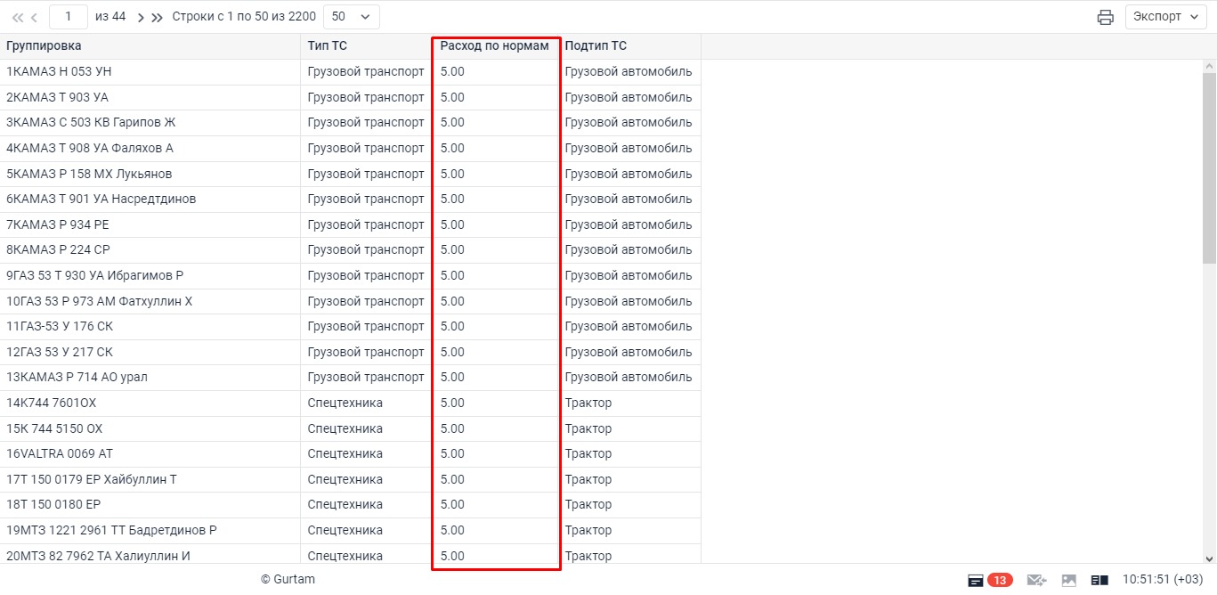 Расход по нормам, л/100 км:", передается всем в шаблоне отчета.