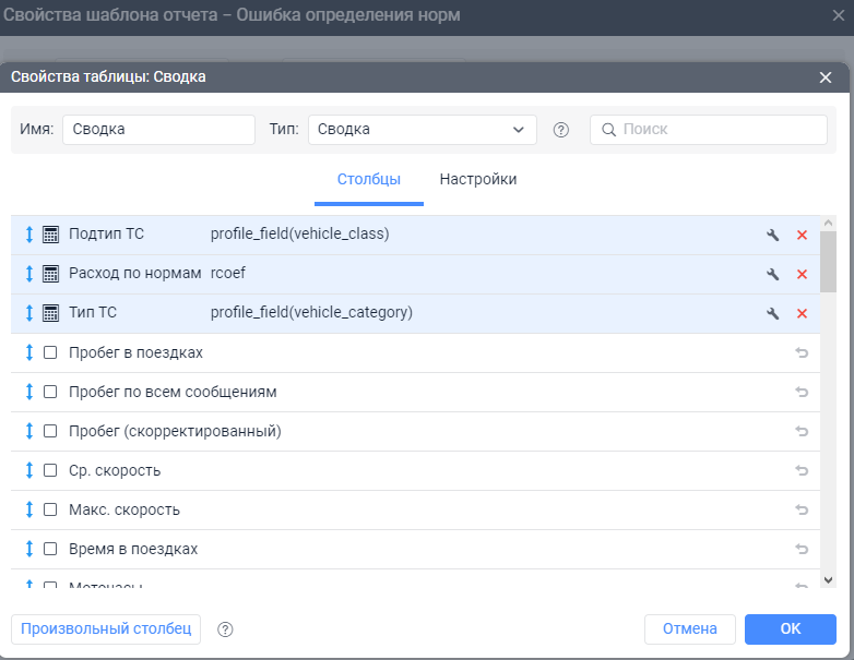 Возникла проблема при формировании шаблона отчета нормы расхода. По всей технике расход по нормам отображается одинаковый, у первого объекта в списке установленная норма расхода во вкладке дополнительно "