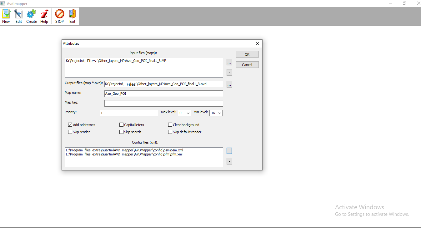 avd_mapper.exe "K:\Projects\Files\Other_layers_MP\Aze_Geo_POI_final1_3.MP" -o "K:\Projects\Files\Other_layers_MP\Aze_Geo_POI_final1_3.avd" -n "Aze_Geo_POI" -p 1 --max-level=0 --min-level=16 -i --pfm-config="L:\Program_files_extra\Guartm\AVD_mapper\AVDMapper\config\osm\osm.xml" --pfm-config="L:\Program_files_extra\Guartm\AVD_mapper\AVDMapper\config\pfm\pfm.xml"