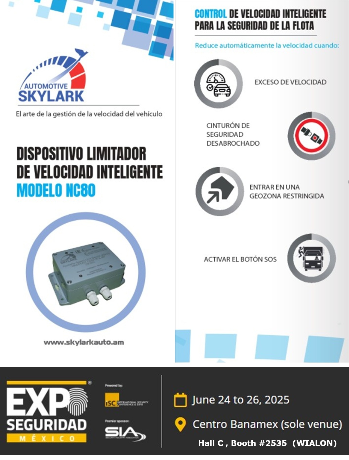 The novel SKYLARK Smart Vehicle Speed Limiter to be presented at the WIALON booth (Hall C, Stand 2535) during Expo Seguridad México in Mexico City. The NC80 speed limiter, connected to the GPS satellite tracking system, telematics, CAN BUS, Tire Pressure Monitoring System, and Driver Monitoring System (DashCam), will automatically reduce the vehicle's speed to a low value in the following cases: